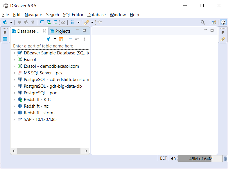Er nagt sich hervorragend durch meine unterschiedlichen datenbanken durch. Er untsterstützt sogar beide varianten. Usually we release a new minor community edition version once per two weeks. Die elemente in bereich b sind zum öffnen von sql editoren da. In bereich c sind alle It has a great ui, it's fast, and the projects feature is a helpful way of organising your files and related information. Dbeaver is one of the best free sql ide's i've seen. If you're considering using dbeaver for your sql work, you can't go wrong with this choice. Persistent query manager database (allows to track sql history) time series charts renderer;.. Im markierten bereich a sind alle elemente zum erstellen, herstellen und löschen von verbindungen zu finden.